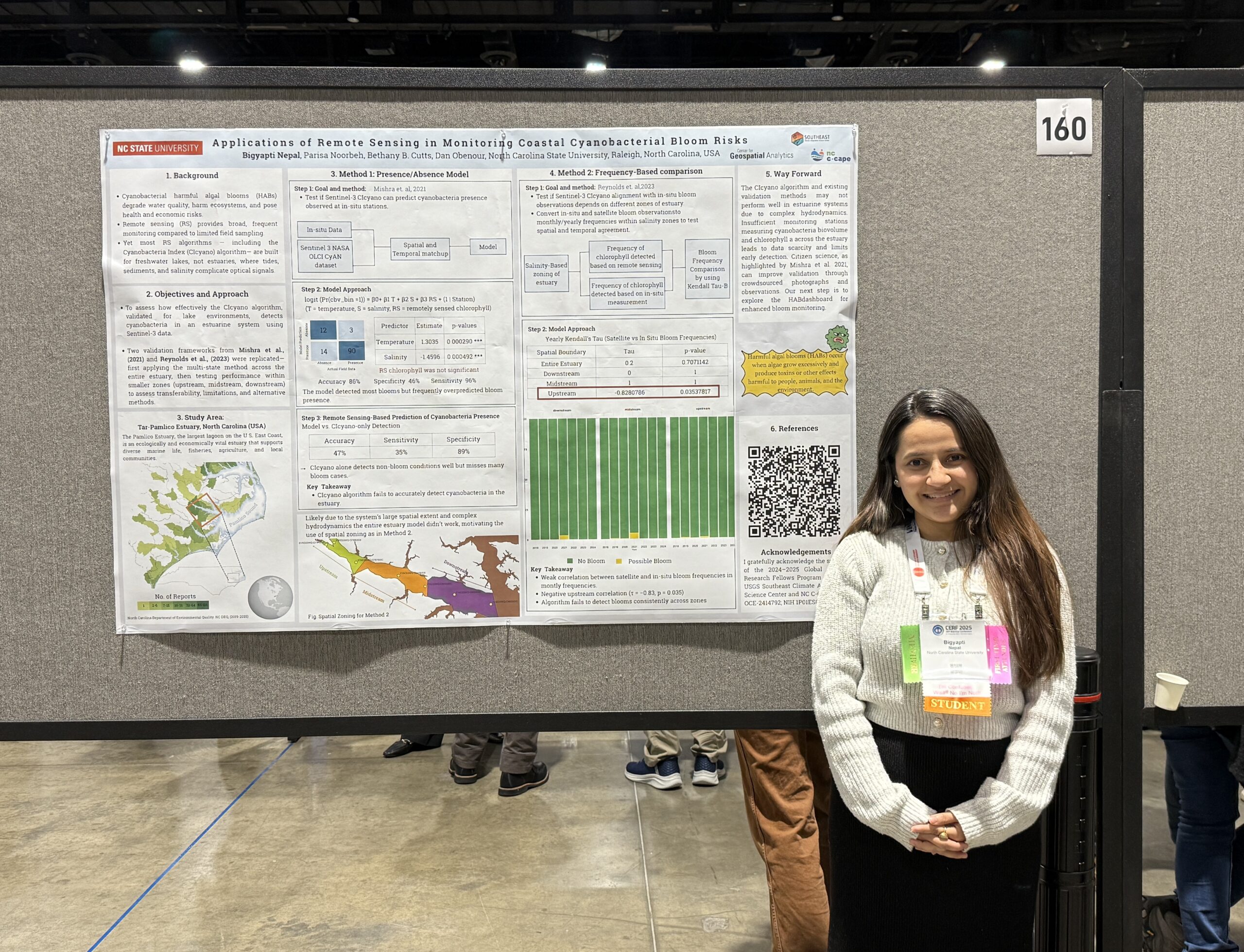My presentation focused on the potential of remote sensing to monitor cyanobacterial bloom risks in coastal environments. Specifically, I’m investigating whether an algorithm originally designed for detecting harmful algal blooms in lakes can be applied reliably to estuaries dynamic areas where freshwater and saltwater meet. My work centers on the Albemarle-Pamlico Sound in coastal North Carolina, the second-largest estuary in the United States. This system supports valuable ecosystems and local economies, but it is increasingly threatened by harmful algal blooms that can damage fisheries, tourism, and water quality.
